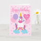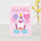 Um adorável unicórnio sentado num arco-íris cercado por balões e confete. No topo do cartão figuram as palavras "Feliz Aniversário", enquanto o balão em forma de coração tem as palavras "um hoje". Um cartão perfeito para o décimo aniversário de uma garota!