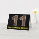A frente deste design de cartões de saudação, tema de aniversário, rústico e divertido apresenta um grande número "11" com um padrão de aparência inspirado em madeira falsa, juntamente com a mensagem "Feliz 11 Aniversário", e um nome personalizado. O dentro apresenta uma mensagem de saudação de aniversário editável, ou talvez pudesse ser apagado e deixado o vazio se uma mensagem fosse escrita manualmente. Um cartão de aniversário personalizável como este pode ser uma maneira divertida de enviar uma mensagem em comemoração do décimo primeiro aniversário de alguém. [~Z0000431]