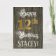 The front of this luxurious and elegant birthday-themed greeting card design features the message “Happy 12th Birthday,”, and a personalized recipient name. Some of the message is in elaborate script-style text, the large number “12th” features a faux/imitation gold-inspired look pattern, and the background has a faux/imitation woodgrain-inspired pattern. The inside has a custom birthday greeting message, or could perhaps be cleared and left blank if a message is to be written by hand instead. A formal, customized birthday greeting card like this might be used to celebrate somebody’s twelfth birthday. [~Z0000561]