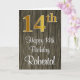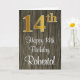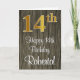 Este na moda, elegante e sofisticado design de cartão de saudação temático de aniversário apresenta um grande número ordinal "14", com uma aparência de imitação/falsa inspirada em ouro, juntamente com a mensagem de saudação de aniversário "Feliz aniversário do 14", e um nome personalizado em uma letra estilo script na frente. O fundo da frente tem um padrão falsa inspirado em madeira. O dentro tem uma mensagem de saudação de aniversário personalizada, ou talvez possa ser apagado e deixado vazio se uma mensagem for escrita manualmente. Um cartão de cumprimentos de aniversário luxuoso e editável como este poderia ser usado para celebrar o décimo quarto aniversário de alguém. [~Z0000519]