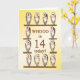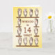 Cartão de 14. Corujas curiosas virando a cabeça para olhar para você e perguntando "Quem tem aniversário hoje?". Um cartão de aniversário engraçado para quem gosta de corujas. As corujas mostradas são corujas de celeiro.