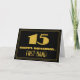 A frente deste estilo de 1920 da década de 30 inspirado, design de cartão de saudação com tema de aniversário com estilo vintage apresenta um grande deco de arte com o número inspirado "15", a mensagem "FELIZ BIRTHDAY", um nome personalizado e um padrão de borda que consiste em linhas. A frente também tem um fundo preto. O dentro apresenta uma mensagem de saudação de aniversário personalizada, ou talvez possa ser apagado e deixado o vazio se uma mensagem for escrita manualmente. Um cartão de aniversário personalizável como este pode ser uma maneira divertida de enviar uma mensagem em comemoração do décimo quinto aniversário de alguém. [~Z0000506]