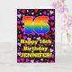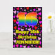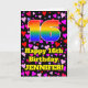 A frente deste design de cartão de aniversário colorido e alegre apresenta um grande número "16" com um padrão de gradiente de espectro de arco-íris. Também apresenta a mensagem "Feliz 16º Aniversário," e um nome personalizável. O fundo da frente apresenta um padrão de formas de coração com cores como rosa, vermelho e roxo. O interior tem uma mensagem de aniversário personalizável ou pode ser deixado em branco se uma mensagem for escrita à mão. Um cartão de aniversário editável e alegre como este pode ser uma maneira divertida de enviar votos de aniversário para alguém que está celebrando seu décimo sexto aniversário.