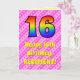 A frente desta divertida e feliz design do cartão de saudação temático de 16 anos apresenta um grande número "16", tendo um espectro colorido de arco-íris inspirado num padrão de gradação. Também apresenta a mensagem "Feliz 16.º aniversário", e um nome de destinatário editável. O fundo da frente apresenta um padrão alegre de cor-de-rosa escuro e faixas de rosa claro contendo formas cardíacas cor-de-rosa amorosas. O dentro apresenta uma mensagem de saudação de aniversário personalizável, ou talvez possa ser apagado e deixado o vazio se uma mensagem for escrita manualmente. Um cartão de aniversário personalizado como este pode ser uma maneira divertida de reconhecer o décimo sexto aniversário de alguém. [~Z0000416]
