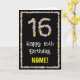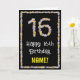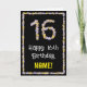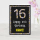 A frente deste design de cartões de aniversário floral e inspirado na natureza tem a mensagem "Feliz 16 de Aniversário", junto com um nome de destinatário personalizado. O grande número "16" e a borda na frente apresentam ícones de flor. O dentro tem uma mensagem de saudação de aniversário personalizável, ou talvez pudesse ser apagado e deixado o vazio se uma mensagem fosse escrita manualmente. Um cartão de boas-vindas de aniversário floral, divertido e personalizável, como este, poderia ser enviado para celebrar o décimo sexto aniversário de alguém. [~Z0000648]