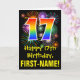 A frente deste design de cartões coloridos, divertidos e empolgantes de aniversário apresenta um grande número "17" com um padrão inspirado no gradiente do espectro arco-íris, juntamente com a mensagem "Feliz 17.º Aniversário", e um nome de destinatário personalizado. A frente também apresenta um padrão de fundo colorido inspirado pela aparência de fogos de artifício comemorativos em explosão. O dentro apresenta uma mensagem de saudação de aniversário personalizada, ou talvez possa ser apagado e deixado o vazio se uma mensagem for escrita manualmente. Um cartão de aniversário personalizável como este pode ser uma maneira divertida de enviar uma mensagem em comemoração do 17º aniversário de alguém. [~Z0000442]