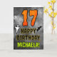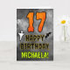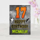 A frente deste design de cartões de saudação de aniversário temático assustador e assustador do Dia das Bruxas apresenta um grande número "17", juntamente com a mensagem "FELIZ ANIVERSÁRIO", e um nome personalizável. Há também representações de um morcego e de um fantasma na frente. O dentro apresenta uma mensagem de saudação de aniversário personalizada, ou talvez possa ser apagado e deixado o vazio se uma mensagem for escrita manualmente. Um cartão de aniversário personalizado como este pode ser uma maneira divertida de enviar uma mensagem em comemoração do décimo sétimo aniversário de alguém que também cai no Halloween (31 de outubro). [~Z0000547]