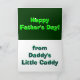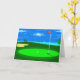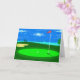 Será um Dia de os pais feliz quando você der ao Pai este cartão do Pai Little Caddy. Cartão que mostra uma ilustração digital do 18º buraco num campo de golfe com um céu azul nublado, lago, árvores, armadilha de areia e a bola de golfe sentada no verde, a polegadas da xícara esperando para ser colocada.