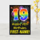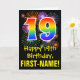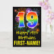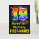 A frente deste design de cartões de saudação de aniversário divertidos, empolgantes e coloridos apresenta um grande número "19" com um padrão inspirado no gradiente do espectro arco-íris, juntamente com a mensagem "Feliz 19º aniversário", e um nome de destinatário personalizável. A frente também apresenta um fogos de artifício comemorativos coloridos que explodiram inspirados no padrão de fundo. O dentro apresenta uma mensagem de saudação de aniversário personalizada, ou talvez possa ser apagado e deixado vazio se uma mensagem for escrita manualmente. Um cartão de aniversário personalizável como este pode ser uma maneira divertida de enviar uma mensagem em comemoração do décimo nono aniversário de alguém. [~Z0000442]