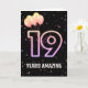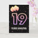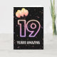 Balões de festa e confete sobre fundo negro com o neon número 19 para o 19º aniversário.