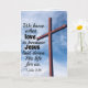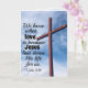 Cartão de saudação das Escrituras retrata um céu azul com uma cruz de madeira e apresenta o versículo bíblico 1 João 3:1, "É assim que conhecemos o amor: Jesus Cristo deu a sua vida por nós. E devemos dar a vida pelos nossos irmãos e irmãs." Fotografia de Aaron Burden.