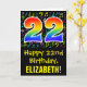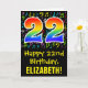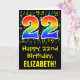A frente deste design de saudação de aniversário divertida, colorida e vibrante apresenta um grande número de "22" tendo um padrão inspirado no gradiente do espectro arco-íris. Também apresenta a mensagem "Feliz 22º Aniversário", e um nome de destinatário personalizado. A frente também tem um padrão de várias notas e símbolos de música com várias cores e tamanhos. O dentro apresenta uma mensagem de saudação de aniversário personalizada, ou talvez possa ser apagado e deixado o vazio se uma mensagem for escrita manualmente. Um cartão de aniversário personalizável como este pode ser uma maneira divertida de celebrar o vigésimo segundo aniversário de alguém. [~Z0000420]