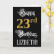 A frente desta design de cartão de saudação de aniversário elegante e elegante apresenta a mensagem "Feliz 23.º Aniversário," e um nome de destinatário personalizado. Parte da mensagem está em um texto estilo script de ornamentado, o grande número "23º" apresenta um padrão de aparência falsa/imitado inspirado em ouro, e o fundo é preto colorido. O dentro tem uma mensagem de saudação de aniversário personalizada, ou talvez pudesse ser apagado e deixado vazio se uma mensagem fosse escrita manualmente. Um cartão de cumprimentos de aniversário, luxuoso e personalizado como este, pode ser enviado para comemorar o vigésimo terceiro aniversário de alguém. [~Z0000559]