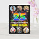 A frente deste design de cartão de saudação de aniversário alegre e ousado apresenta um grande número "25" com um espectro de arco-íris multicolorido vibrante inspirado em gradiente, juntamente com a mensagem "HAPPY 25 BIRTHDAY", e um nome personalizado, em um padrão inspirado em fogos de artifício multicoloridos. No topo e no fundo da frente estão imagens que podem ser personalizadas, talvez com fotos da família e amigos do receptor. O dentro tem uma mensagem de saudação de aniversário personalizável, ou talvez pudesse ser apagado e deixado o vazio se uma mensagem fosse escrita manualmente. Um cartão de saudação de aniversário, personalizado e otimizado, como este, poderia ser enviado para celebrar o vigésimo quinto aniversário de alguém. (Fotografia © Storytree Studios, Stanford, CA.) [~Z0000660]