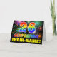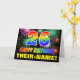 A frente desta divertida, colorida e animada design de cartão de saudação com tema de aniversário apresenta um grande número "26" e a mensagem "FELIZ ANIVERSÁRIO", ambos tendo um gradiente de padrão inspirado no espectro do arco-íris, juntamente com um nome ousado de destinatário personalizado amarelo. A frente também apresenta um padrão de fundo multicolorido inspirado pela aparência de fogos de artifício comemorativos em explosão. O dentro apresenta uma mensagem de saudação de aniversário personalizada, ou talvez possa ser apagado e deixado o vazio se uma mensagem for escrita manualmente. Um vibrante cartão de aniversário personalizável como este pode ser uma maneira divertida de enviar uma mensagem celebrando o vigésimo sexto aniversário de alguém. [~Z0000471]