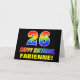 A frente deste alegre, colorido e divertido design de saudação de aniversário apresenta um grande número "26" e a mensagem "FELIZ BIRTHDAY", ambos coloridos com um padrão inspirado no gradiente do espectro do arco-íris, juntamente com um nome ousado de destinatário personalizado amarelo. A frente também apresenta um simples fundo preto. O dentro tem uma mensagem de saudação de aniversário personalizada, ou talvez possa ser apagado e deixado vazio se uma mensagem for escrita manualmente. Um vibrante cartão de aniversário personalizado como este pode ser uma maneira divertida de celebrar o vigésimo sexto aniversário de alguém. [~Z0000472]