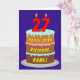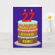 Este design de carta de saudação divertida e alegre, com tema de aniversário, apresenta uma representação de um bolo de aniversário de três níveis com velas em forma numérica no topo, mostrando o número "27", juntamente com a mensagem "FELIZ 27.º ANIVERSÁRIO", e um nome de destinatário personalizado. O dentro apresenta uma mensagem de saudação de aniversário personalizada, ou talvez possa ser apagado e deixado o vazio se uma mensagem for escrita manualmente. Um cartão de boas-vindas de aniversário otimizado e editável como este poderia ser usado para reconhecer o vigésimo sétimo aniversário de alguém. [~Z0000620]