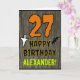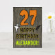 A frente desse design de cartão de saudação temático de aniversário de Halloween assustador e assustador apresenta um grande número "27". Também apresenta a mensagem "FELIZ ANIVERSÁRIO", além de um nome personalizável. Há também representações de um fantasma e um morcego na frente. O dentro apresenta uma mensagem de saudação de aniversário personalizada, ou talvez possa ser apagado e deixado o vazio se uma mensagem for escrita manualmente. Um cartão de aniversário personalizado como este pode ser uma maneira divertida de enviar desejos de aniversário a alguém que comemora seu vigésimo sétimo aniversário e que também foi nascer no Halloween (31 de outubro). [~Z0000410]