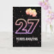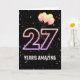 Balões de festa e confete sobre fundo negro com o neon número 27 para um aniversário de 27 anos.