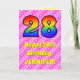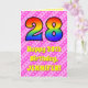 A frente deste feliz e festivo design de 28 anos, tema de aniversário, apresenta um grande número de "28", com um padrão colorido inspirado pela aparência de um espectro do arco-íris. Também apresenta a mensagem "Feliz 28.º Aniversário", seguida de um nome de destinatário editável. O plano de fundo da frente apresenta um padrão rosa-escuro e de faixas de rosa claro contendo formas cardíacas cor-de-rosa amorosas. O dentro apresenta uma mensagem de saudação de aniversário personalizada, ou talvez possa ser apagado e deixado o vazio se uma mensagem for escrita manualmente. Um cartão de aniversário personalizável como este pode ser uma maneira divertida de reconhecer o vigésimo oitavo aniversário de alguém. [~Z0000416]
