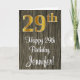 Este design de cartão de saudação temático, elegante e na moda de aniversário, luxuoso, apresenta um grande número ordinal "29º", com uma imitação/aparência falsa de ouro, juntamente com a mensagem de saudação de aniversário "Feliz 29º aniversário" e um nome personalizável em uma fonte estilo script na frente. O fundo da frente tem um padrão falsa inspirado em madeira. O dentro tem uma mensagem de saudação de aniversário personalizada, ou talvez pudesse ser apagado e deixado vazio se uma mensagem fosse escrita manualmente. Um sofisticado cartão de saudação de aniversário personalizado como este poderia ser usado para celebrar o vigésimo nono aniversário de alguém. [~Z0000519]