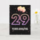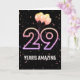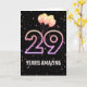 Balões de festa e confete sobre fundo negro com o neon número 29 para um aniversário de 29 anos.