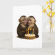 2 macacos capuchinhos fofos se abraçando, bolo com dizer Feliz aniversário