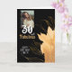 Elegante 30 e Fabuloso Cartão com fotos de Folhagem. 30 e texto fabuloso em um roteiro branco com um nome e uma folhagem de ouro em um fundo preto. Personalize com sua foto, seu nome e a idade. Adicione o dentro de texto à placa ou apague-a.