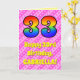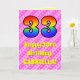 A frente deste feliz e feliz design de 33 anos do templo do cartão de saudação apresenta um grande número "33" com um padrão colorido inspirado pela aparência de um espectro do arco-íris. Também apresenta a mensagem "Happy 33rd Birthday", seguida de um nome de destinatário personalizável. O fundo da frente apresenta um padrão de cor-de-rosa-escuro e faixas de rosa claro contendo formas cardíacas cor-de-rosa amorosas. O dentro apresenta uma mensagem de saudação de aniversário personalizada, ou talvez possa ser apagado e deixado o vazio se uma mensagem for escrita manualmente. Um cartão de aniversário como este pode ser uma maneira divertida de enviar desejos de aniversário a alguém que comemora seus trinta e três anos. [~Z0000416]