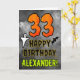 A frente deste design de cartões de saudação de aniversário temático e assustador do Hallowe'en apresenta um grande número "33" e a mensagem "FELIZ ANIVERSÁRIO", além de um nome personalizado. Há também representações de um morcego e de um fantasma na frente. O dentro apresenta uma mensagem de saudação de aniversário personalizada, ou talvez possa ser apagado e deixado o vazio se uma mensagem for escrita manualmente. Um cartão de aniversário como este pode ser uma maneira divertida de enviar desejos de aniversário a alguém que comemora seus trinta e três anos e que também foi nascer no Halloween (31 de outubro). [~Z0000547]