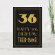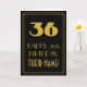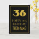 Este design de cartão de aniversário inspirado no estilo da era 1920/1930 e vintage/retro apresenta um grande número "36" com aparência art déco, a mensagem "FELIZ ANIVERSÁRIO DE 36 ANOS,", um nome personalizado e um padrão de borda composto por linhas finas na frente. O fundo da frente é colorido de preto. O interior tem uma mensagem de aniversário editável, ou talvez possa ser limpo e deixado em branco se uma mensagem for escrita à mão. Um cartão de aniversário personalizável como este pode ser enviado em celebração ao trigésimo sexto aniversário de alguém.
