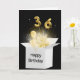 Balões Dourados e feixes de luz cintilantes brilham em uma caixa branca sobre fundo preto para 36 anos Feliz Aniversário na caixa branca pode ser mudado.