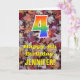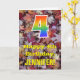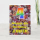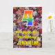 A frente deste design de cartão de aniversário colorido, inspirado na natureza e rústico apresenta um grande número "4" com um padrão de gradiente de espectro de arco-íris. Também apresenta a mensagem "Feliz 4º Aniversário," e um nome personalizado. A frente apresenta um fundo que retrata folhas caídas rústicas de outono. O interior apresenta uma mensagem de aniversário personalizada, ou talvez possa ser limpo e deixado em branco se uma mensagem for escrita à mão. Um cartão de aniversário personalizado como este pode ser uma maneira divertida de enviar votos de feliz aniversário para alguém que está celebrando seu quarto aniversário.