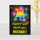A frente deste design de saudação de aniversário colorida, excitante e divertida apresenta um grande número "4" com um padrão inspirado no gradiente do espectro arco-íris, juntamente com a mensagem "Feliz 4º aniversário", e um nome de destinatário personalizado. A frente também tem um padrão de fundo colorido inspirado em fogos de artifício comemorativos que explodem. O dentro apresenta uma mensagem de saudação de aniversário personalizada, ou talvez possa ser apagado e deixado o vazio se uma mensagem for escrita manualmente. Um cartão de aniversário personalizado como este pode ser uma maneira divertida de celebrar o quarto aniversário de alguém. [~Z0000442]