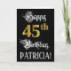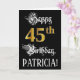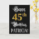 A frente deste design de cartão de cumprimentos temático de aniversário ornamentado e luxuoso apresenta a mensagem “Feliz Aniversário de 45 anos”, e um nome de destinatário personalizado. Parte da mensagem está em um texto estilo caligrafia luxuoso, o grande número “45º” apresenta um padrão de aparência inspirado em ouro falso/imitação, e o fundo é colorido de preto. O interior tem uma mensagem de aniversário personalizável, ou talvez possa ser limpo e deixado em branco se uma mensagem for escrita à mão. Um cartão de aniversário personalizado e elegante como este pode ser uma maneira respeitável de enviar cumprimentos de aniversário a alguém que está celebrando seu aniversário de 45 anos.