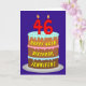 A frente deste alegre e otimista design de cartão de saudação de aniversário apresenta uma representação de um bolo de aniversário de três níveis com velas em forma numérica no topo mostrando o número "46", juntamente com a mensagem "FELIZ 46° ANIVERSÁRIO", e um nome de destinatário editável. O dentro tem uma mensagem de saudação de aniversário editável, ou talvez possa ser apagado e deixado vazio se uma mensagem for escrita manualmente. Um bom e personalizado cartão de cumprimentos de aniversário como este pode ser enviado para comemorar o quarenta e sexto aniversário de alguém. [~Z0000620]