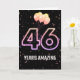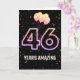 Balões de festa e confete sobre fundo negro com o neon número 46 para um aniversário de 46 anos.