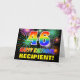 A frente deste design de cartão de saudação colorida, alegre e divertida com tema de aniversário apresenta um grande número "46" e a mensagem "FELIZ ANIVERSÁRIO", ambas coloridas com um padrão inspirado de gradiente de espectro arco-íris, junto com um nome de destinatário personalizável amarelo ousado. A frente também tem um padrão de fundo multicolorido inspirado pela aparência de fogos de artifício comemorativos em explosão. O dentro apresenta uma mensagem de saudação de aniversário personalizada, ou talvez possa ser limpo e vazio à esquerda se uma mensagem for escrita à mão. Um vibrante cartão de aniversário personalizável como este pode ser uma maneira divertida de reconhecer o quarenta e sexto aniversário de alguém. [~Z0000471]
