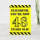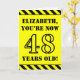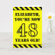 A frente deste design de cartão de saudação com tema de atenção e ousado aniversário apresenta um nome personalizado e a mensagem "VOCÊ AGORA TEM 48 ANOS!" em texto de aparência de estêncil preto em um fundo de cor amarela. A parte frontal também apresenta um padrão de listras amarelas e pretas que se chama olho nas bordas superior e inferior. O dentro apresenta uma mensagem de saudação de aniversário personalizada, ou talvez possa ser apagado e deixado o vazio se uma mensagem for escrita manualmente. Um cartão de aniversário personalizado como este pode ser uma maneira divertida de enviar desejos de aniversário a alguém que comemora seus quarenta oitavos anos. [~Z0000413]