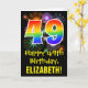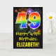 A frente deste design de cartões de saudação divertidos, coloridos e excitantes, com tema de aniversário, apresenta um grande número de "49", tendo um padrão inspirado na gradação do espectro do arco-íris. Também apresenta a mensagem "Feliz 49º aniversário", e um nome de destinatário editável. A frente também apresenta um padrão de fundo colorido inspirado pela aparência de fogos de artifício comemorativos em explosão. O dentro apresenta uma mensagem de saudação de aniversário personalizada, ou talvez possa ser apagado e deixado vazio se uma mensagem for escrita manualmente. Um cartão de aniversário personalizável como este pode ser uma maneira divertida de enviar uma mensagem celebrando o quarenta e nono aniversário de alguém. [~Z0000442]