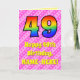 A frente deste alegre e festivo design de 49 anos com o tema do aniversário apresenta um grande número "49" com um padrão colorido inspirado pelo aparecimento de um espectro do arco-íris. Também apresenta a mensagem "Feliz 49º aniversário", e um nome de destinatário personalizado. O fundo da frente apresenta um padrão alegre de cor-de-rosa escuro e faixas de rosa claro contendo formas cardíacas cor-de-rosa amorosas. O dentro apresenta uma mensagem de saudação de aniversário personalizada, ou talvez possa ser apagado e deixado o vazio se uma mensagem for escrita manualmente. Um cartão de aniversário personalizável como este pode ser uma maneira divertida de reconhecer o quarenta e nono aniversário de alguém. [~Z0000416]