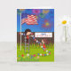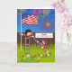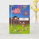 Feliz cartão de saudação em papel, em 4 de julho, com um casal decorando o quintal, pendurando um beliche patriótico em uma cerca quando fogos de artifício explodem no céu. Arte, imagem e direitos de autor versos © Shoaff Ballanger Studios, 2022.