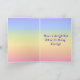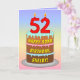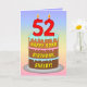Este design de carta de saudação de aniversário divertida e alegre apresenta uma representação em estilo cartoon de um bolo de aniversário de três níveis com velas em forma numérica no topo mostrando o número "52", juntamente com a mensagem "HAPPY 52ND BIRTHDAY", e um nome de destinatário personalizado. O fundo da frente tem um espectro de gradiente de vários cores do arco-íris pastel inspirado em gradiente. O dentro tem uma mensagem de saudação de aniversário personalizada, ou talvez pudesse ser apagado e deixado vazio se uma mensagem for escrita manualmente. Um cartão de saudação de aniversário otimista e editável como este poderia ser enviado para celebrar o quinquagésimo segundo aniversário de alguém. [~Z0000625]