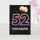 Balões de festa e confete sobre fundo negro com o neon número 52 para um 52º aniversário.
