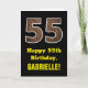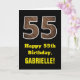 Esta divertida e rústica carta de saudação de aniversário apresenta um grande número "55" com um padrão de aparência inspirado em madeira falsa na frente. A frente também apresenta a mensagem de saudação de aniversário "Feliz 55º aniversário", e um nome de destinatário editável. O dentro apresenta uma mensagem de saudação de aniversário personalizada, ou talvez possa ser apagado e deixado o vazio se uma mensagem for escrita manualmente. Um cartão de aniversário personalizado como este pode ser uma maneira divertida de enviar desejos de aniversário a alguém que comemora seus cinquenta anos. [~Z0000433]