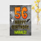 The front of this scary and spooky Hallowe’en themed birthday greeting card design features a large number “56” and the message “HAPPY BIRTHDAY,”, plus an editable name. There are also depictions of a bat and a ghost on the front. The inside features an editable birthday greeting message, or could perhaps be cleared and left blank if a message is to be written by hand instead. A personalized birthday card like this might be a fun way to send a message in celebration of somebody’s fifty sixth birthday that also falls on Halloween (October 31st). [~Z0000547]