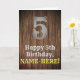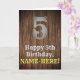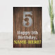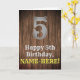Este olhar country e o American Wild West inspiraram o design de um cartão de saudação de aniversário apresentando um grande número "5" rústico, a mensagem "Feliz 5 Aniversário", um nome personalizado, e um padrão de aparência inspirado em faux/imitation wood grain. O dentro tem uma mensagem de saudação de aniversário personalizável, ou talvez pudesse ser apagado e deixado o vazio se uma mensagem fosse escrita manualmente. Um cartão de saudação de aniversário editável como este poderia ser enviado para celebrar o quinto aniversário de alguém. [~Z0000469]