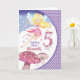 For a little girl age 5. This sweet birthday card features a pretty little fairy in a pink dress flying over two decorative mushrooms. She has long yellow hair and is carrying a tiny star. In the background are fluffy white clouds, and on her right side is a border of tiny white daisies on a lilac background.