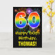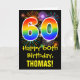 A frente deste design de cartão de aniversário emocionante, divertido e colorido apresenta um grande número "60" com um padrão de gradiente de espectro de arco-íris. Também apresenta a mensagem "Feliz 60º Aniversário," e um nome de destinatário personalizado. A frente também tem um padrão de fundo colorido inspirado na aparência de fogos de artifício comemorativos estourando. O interior apresenta uma mensagem de aniversário personalizável ou pode ser limpo e deixado em branco se uma mensagem for escrita à mão. Um cartão de aniversário personalizável como este pode ser uma maneira divertida de celebrar o sexagésimo aniversário de alguém.