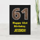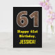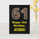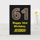 Este design de cartão de cumprimentos temático de aniversário rústico e divertido apresenta um grande número "61" tendo um padrão de estilo de fibra falsa inspirado em madeira na frente. A frente também apresenta a mensagem de saudação de aniversário "Feliz aniversário de 61ruas", e um nome de destinatário personalizado. O dentro apresenta uma mensagem de saudação de aniversário personalizável, ou talvez possa ser apagado e deixado o vazio se uma mensagem for escrita manualmente. Um cartão de aniversário personalizado como este pode ser uma maneira divertida de enviar desejos de aniversário a alguém que comemora seu sessenta aniversário. [~Z0000433]